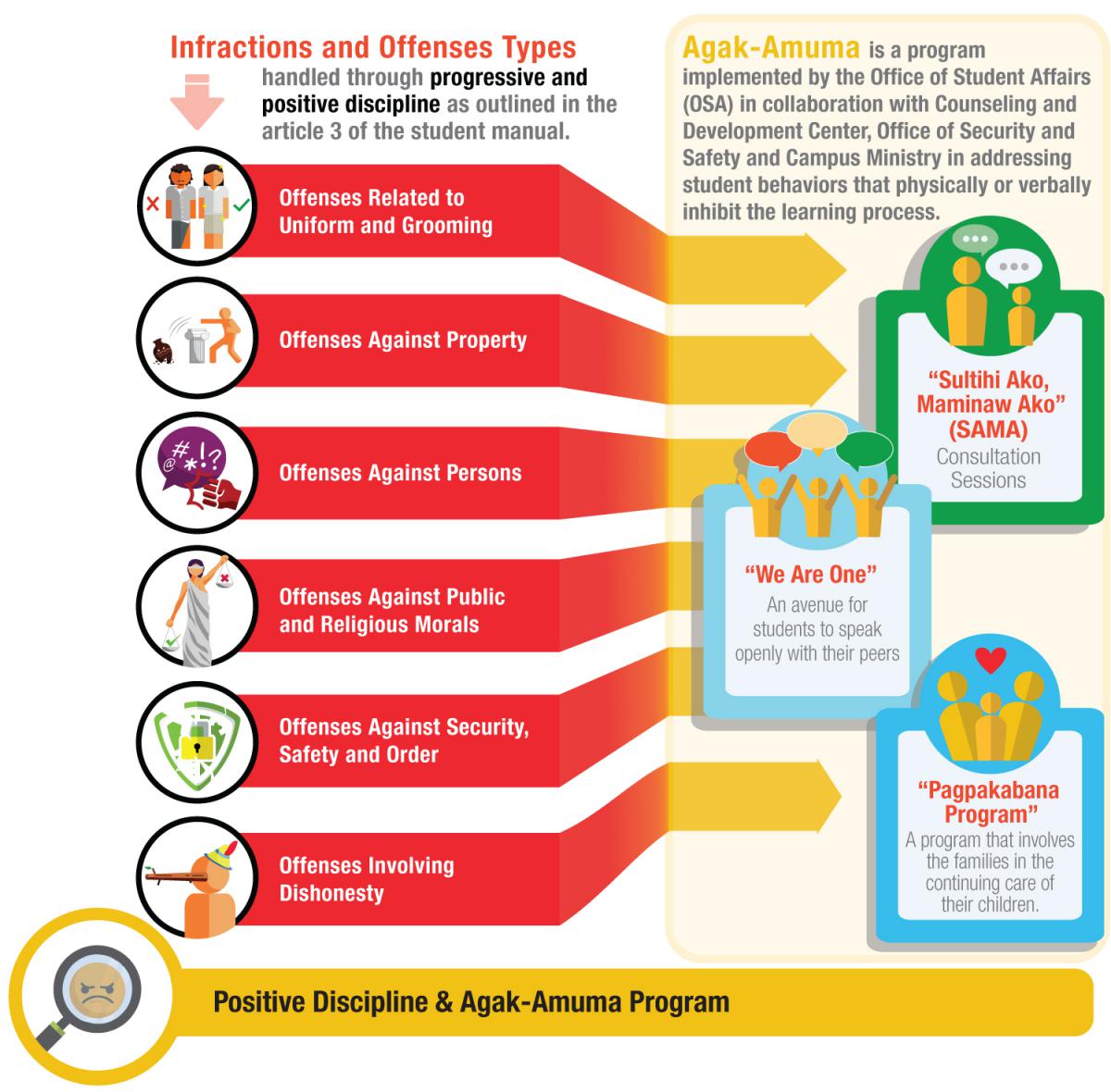 The Agak-Amuma Program is a transformative program offered by the Office of Student Affairs for students who would be needing such a program. This program is implemented by the office in collaboration with the Counseling and Development Center, Office of Security and Safety, and the Campus Ministry in addressing student behaviours that physically or verbally inhibit the learning process. In this program, students will be able to talk about their issues, actions, plans and boundaries.
